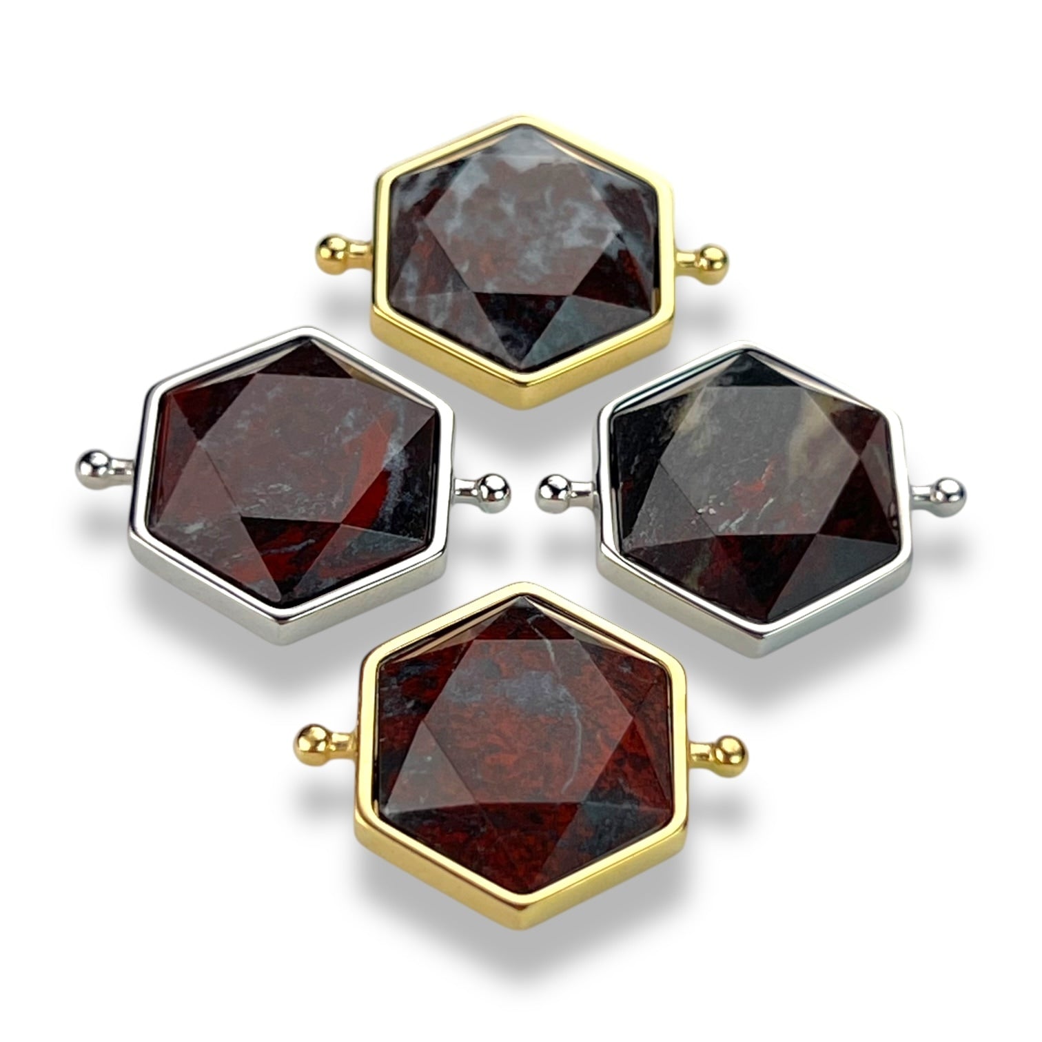 This star-cut hexagon element features natural Bloodstone, precision-cut into a strong geometric form. The faceted star design highlights Bloodstone’s deep graphite tones and subtle red accents. This powerful piece channels protective, steady energy while bringing balance and strength to any look.
