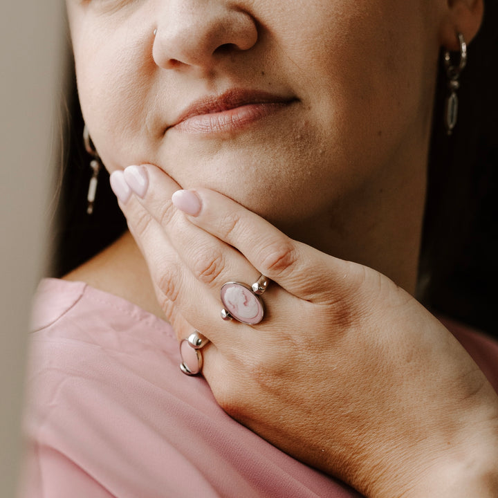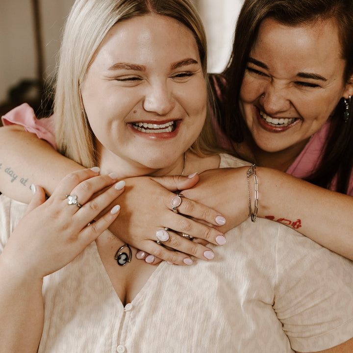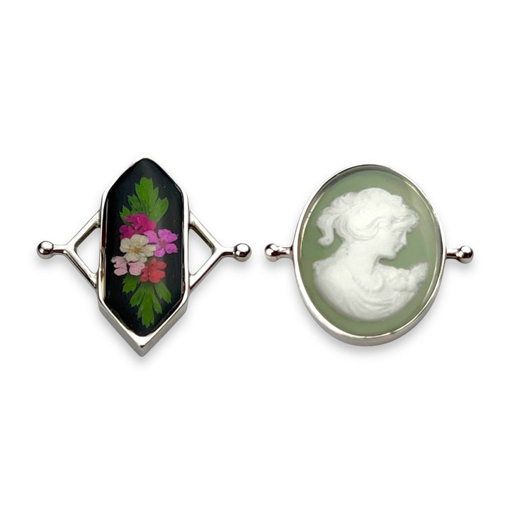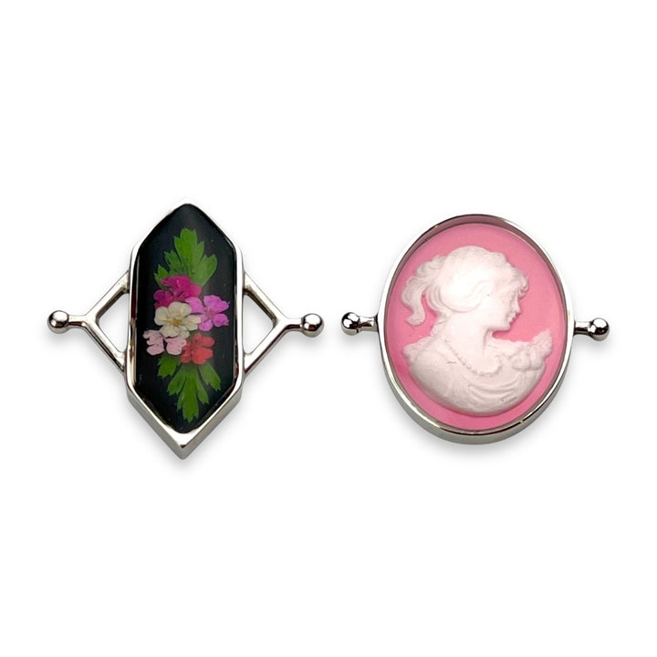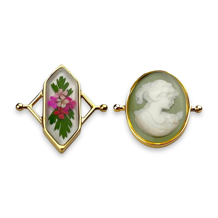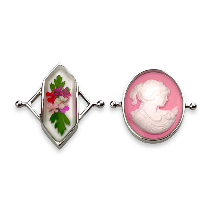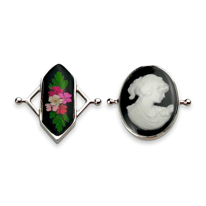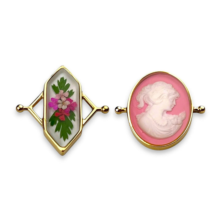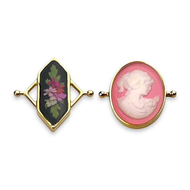 “We were inspired to create this collection by our love of vintage styles. When we think of vintage jewelry, we picture cameos and flower bouquets—there’s something so beautiful about the contrast between the face and the background. So we thought, why not create our own using CONQUERing? We felt flowers would pair perfectly with the cameos, and we chose a variety of background colors so they can complement any outfit.” — Ellie and Olivia