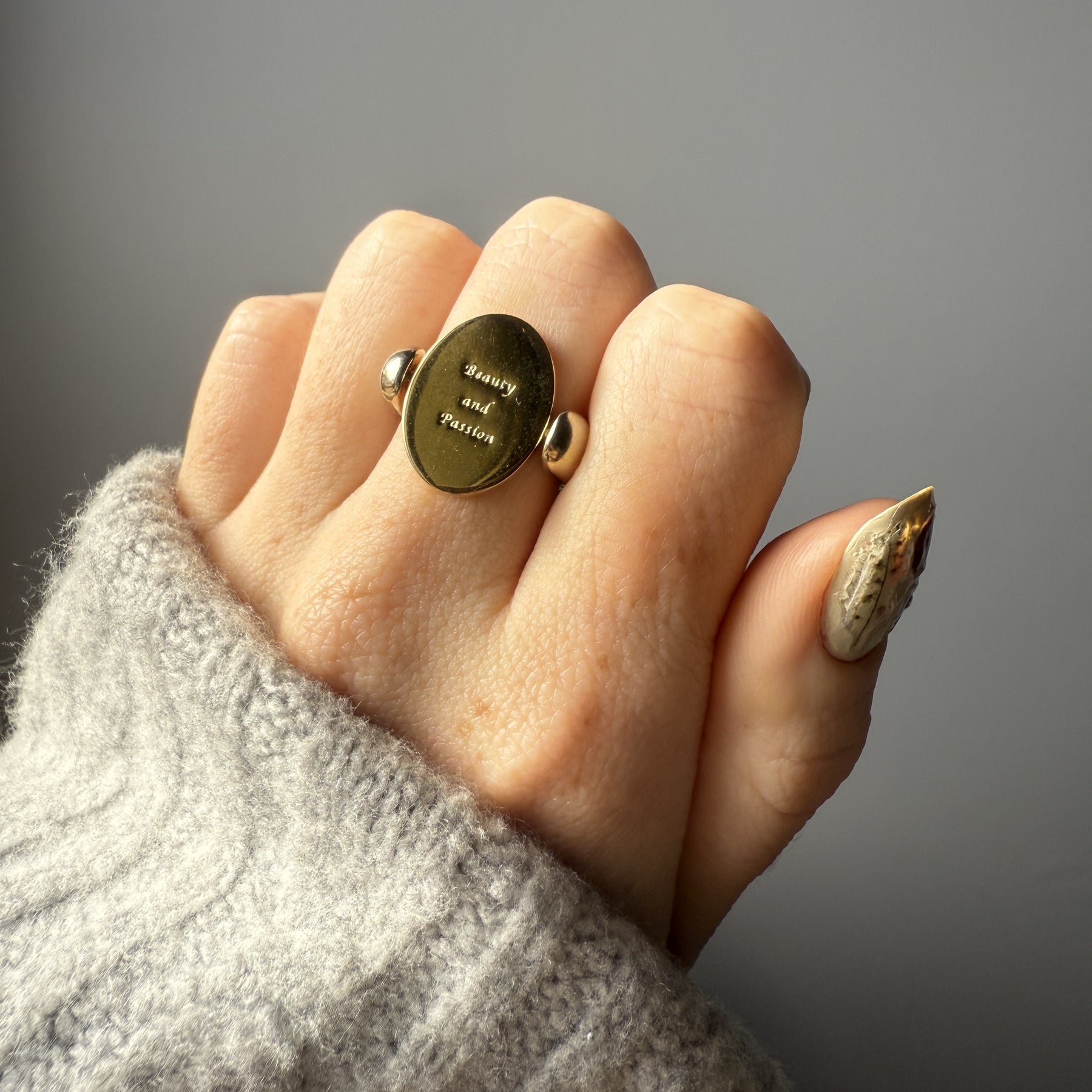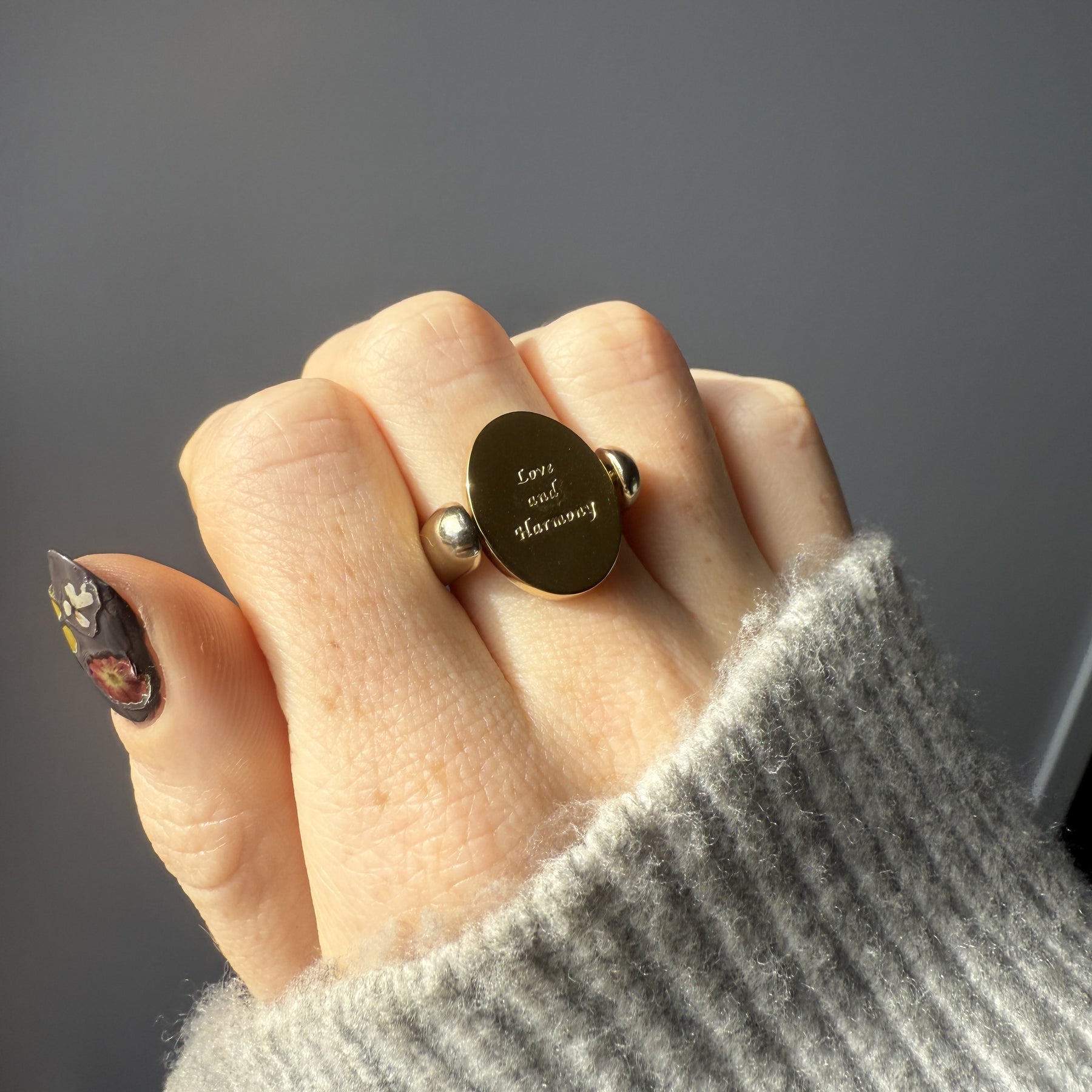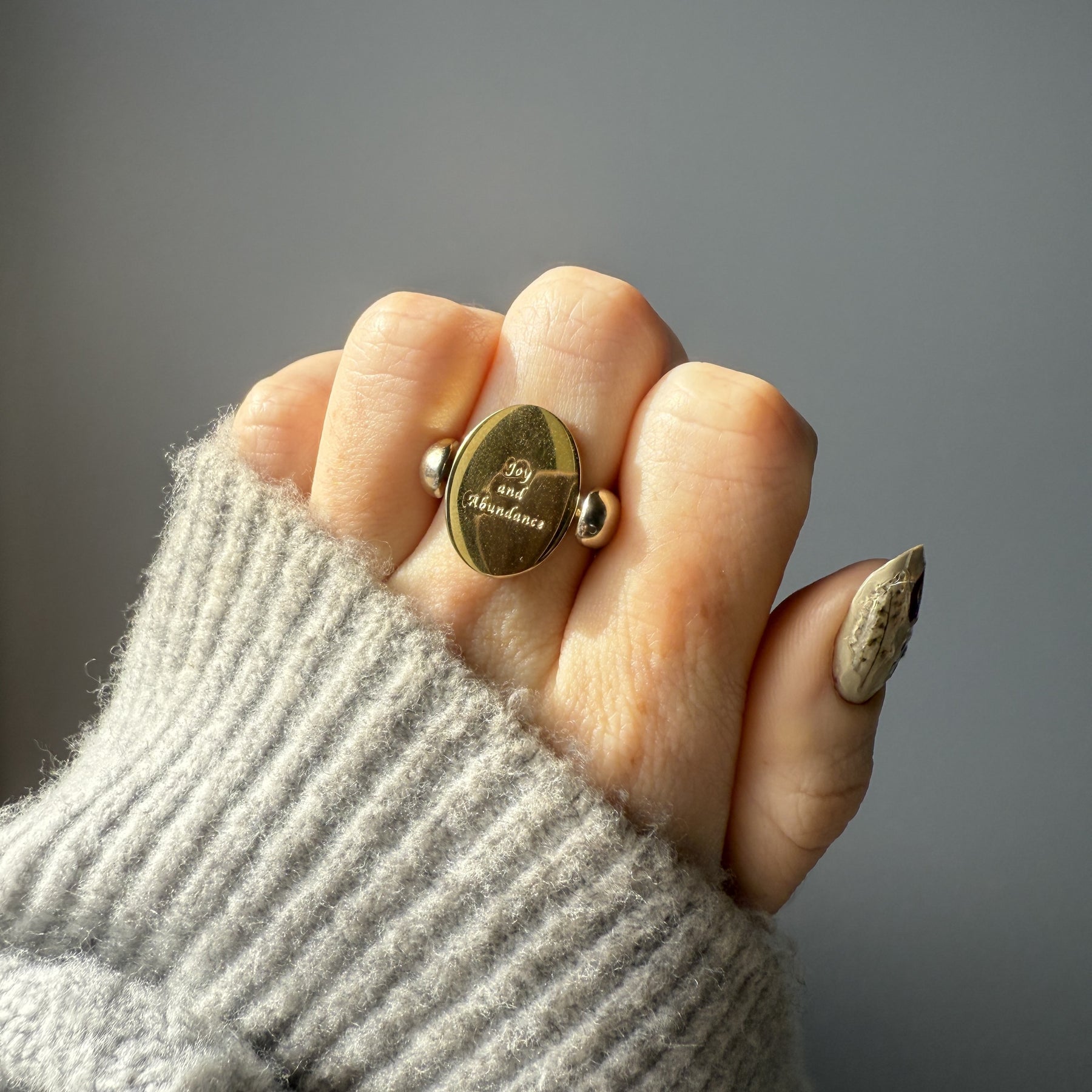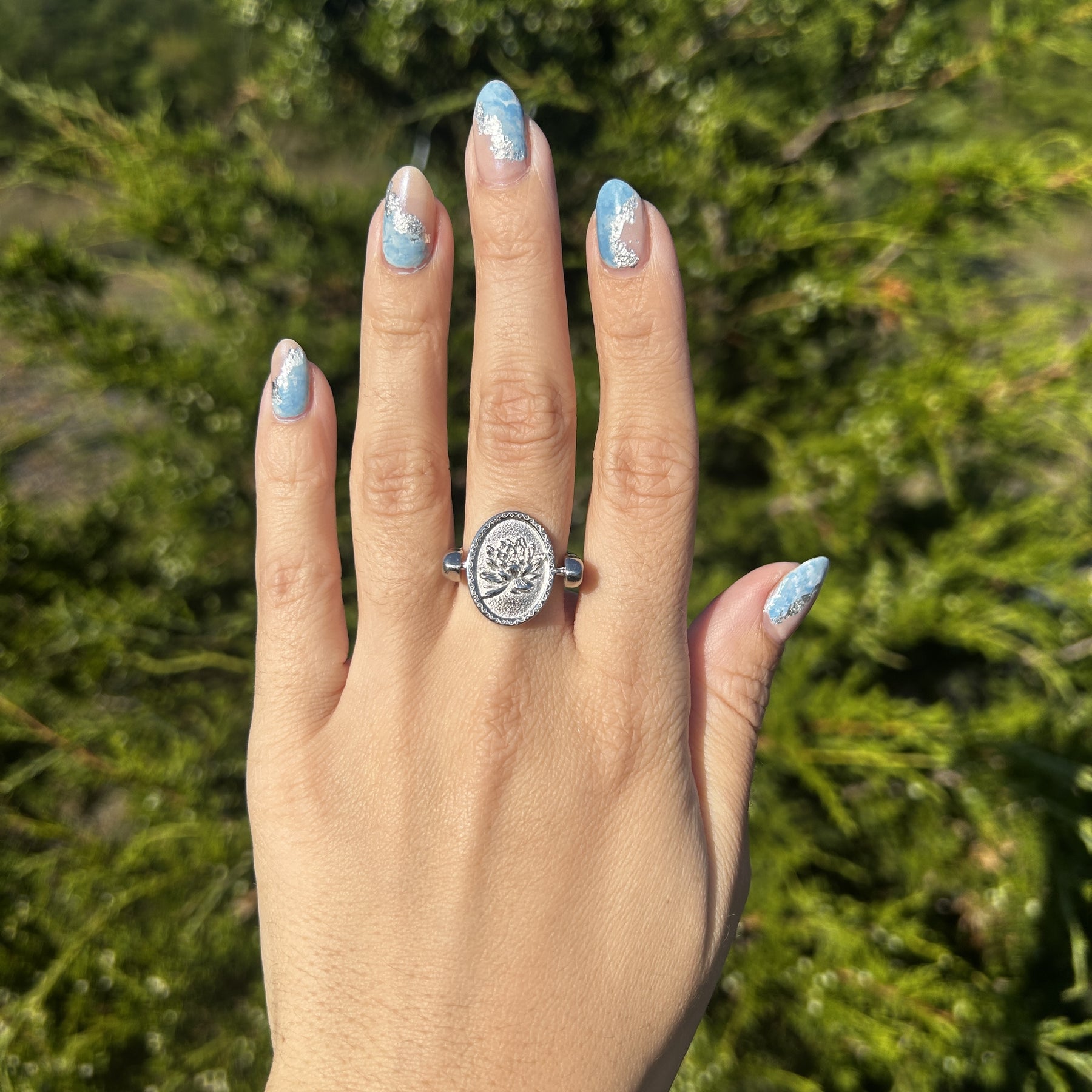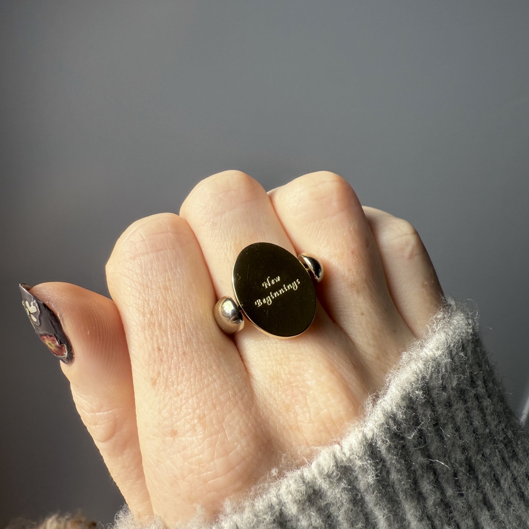 Designed to fit any of our elements, our stainless steel ring band comes in sizes 4-15 and is available in two different colors: silver & gold. Just pop your chosen spinner on the band by angling one “arm” of the disc through the open part of the u-shaped ring, and repeat on the other side. Pull the element straight up into the tips of the ring until it clicks into place. (Learn more about changing your element here).