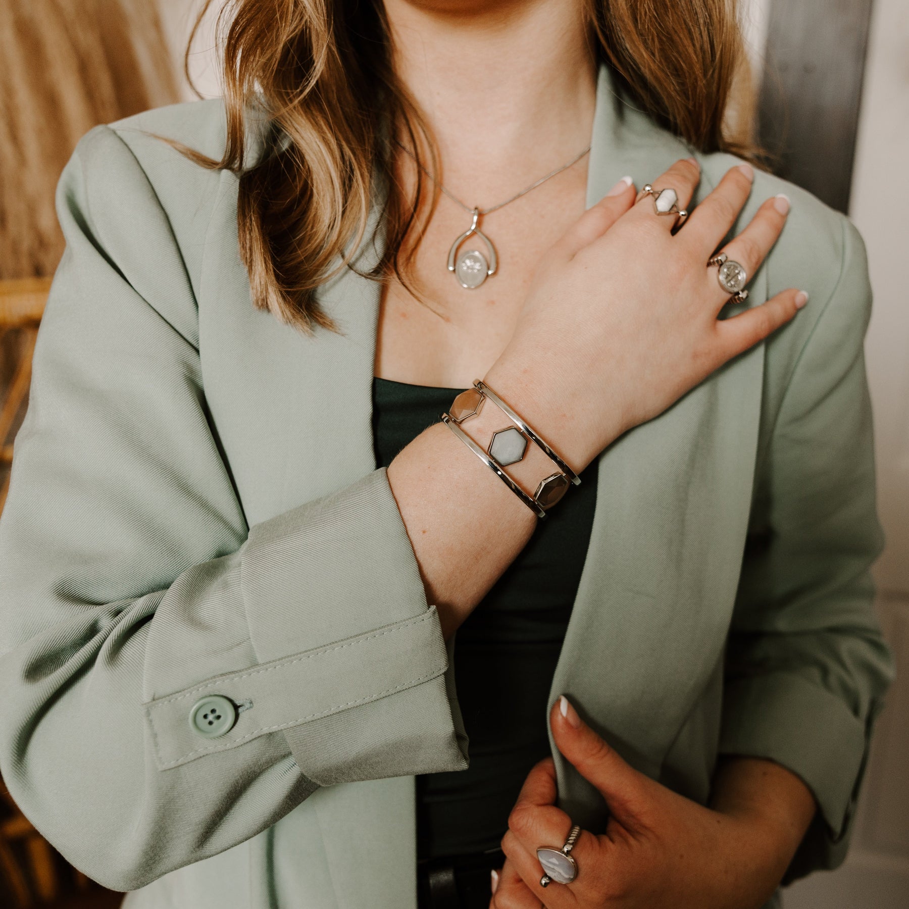 The long-awaited CONQUERcuff has officially made its way from the runway to your wrist — designed to hold up to seven interchangeable elements and showcase every facet of who you are. This 3-Element Hexagon Set highlights geometric brilliance through three crystals that balance energy, expression, and grounding.