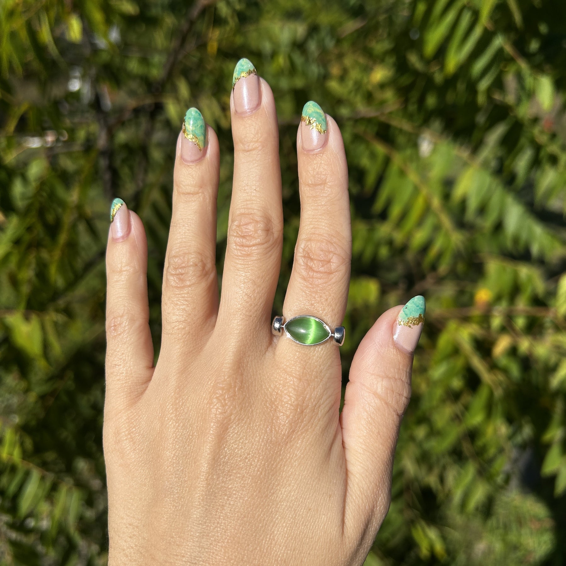 Crafted from fiber-optic glass, the Cat’s Eye reflects light in a sharp vertical line, creating a glowing effect as enchanting as a real feline’s stare. Sleek, elegant, and endlessly intriguing, it’s a striking piece to elevate any look.