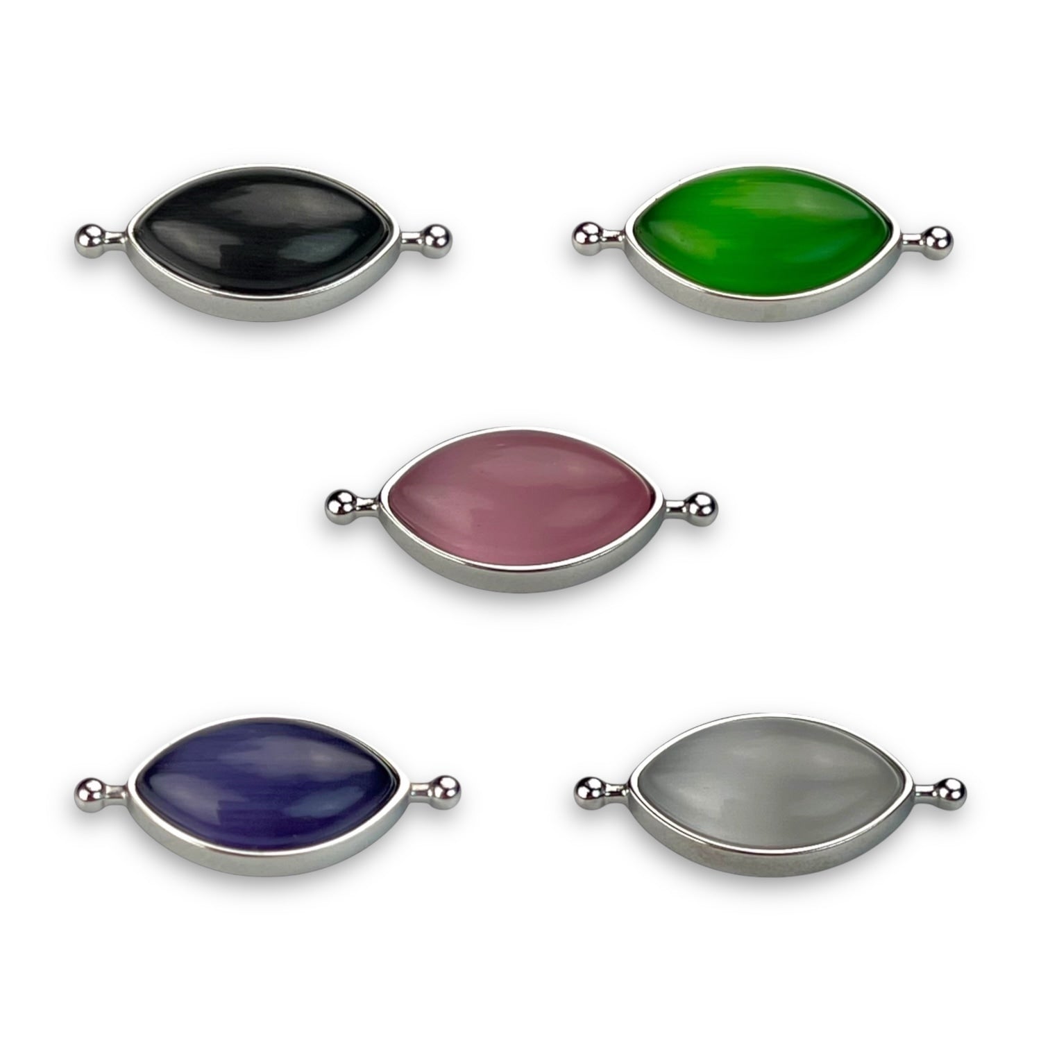 Experience the complete magic of the Cat’s Eye with our exclusive full set, featuring all five stunning shades: Black, Green, Pink, Purple, and White. This elegant marquise-cut element—crafted from fiber-optic glass—reflects light in a sharp vertical line, creating a captivating glow as mesmerizing as a feline’s gaze.